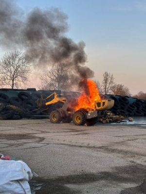 Auf Anfahrt bestätigte sich das Lagebild. Mittels Schnellangriff löschten wir den brennenden Radlader ab und benetzten ihn anschließend mit F500 (Sonderlöschmittel).